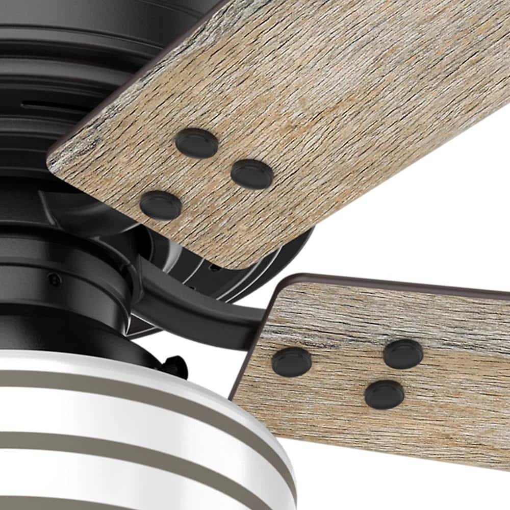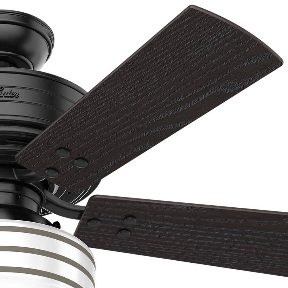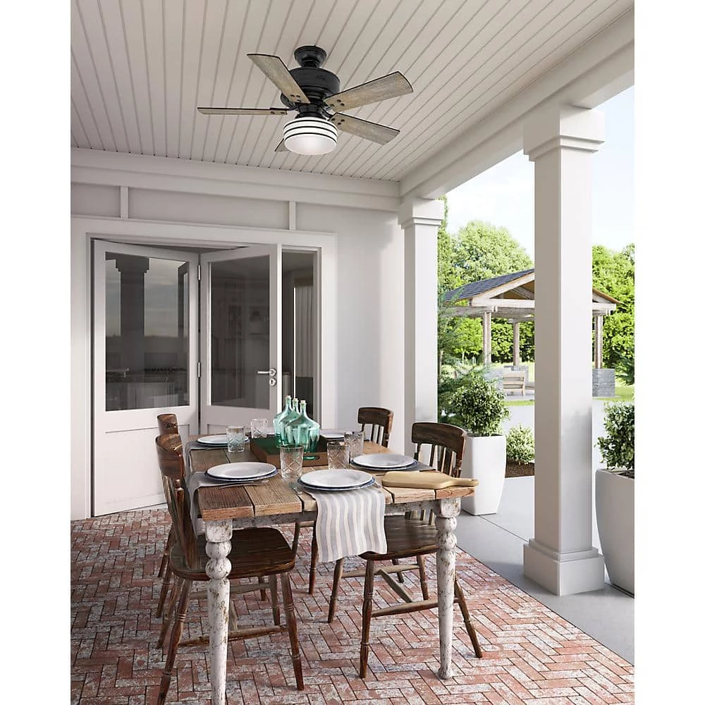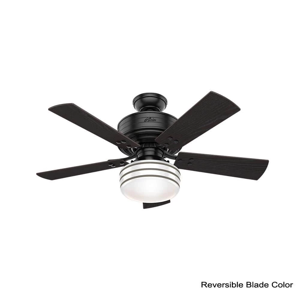 Make a room cooler with this Hunter Cedar Key 44-in. ceiling fan. Great for covered porches and patios, this damp-rated fan provides four speeds for maximum airflow. It offers a 3-speed WhisperWind reversible motor for quiet operation. For versatile lighting options, it includes one dimmable 9W LED bulb and a handheld remote. Navy-striped glass, a matte black finish and five reversible blades create a classic look.
