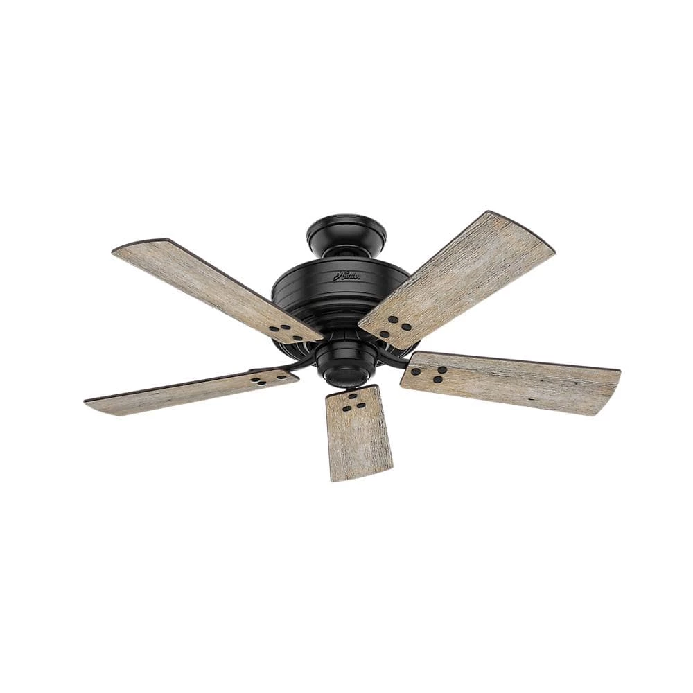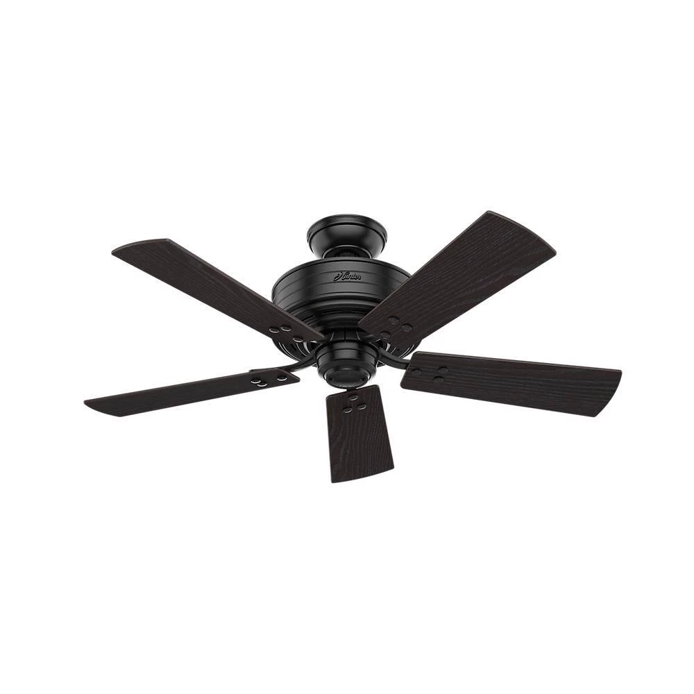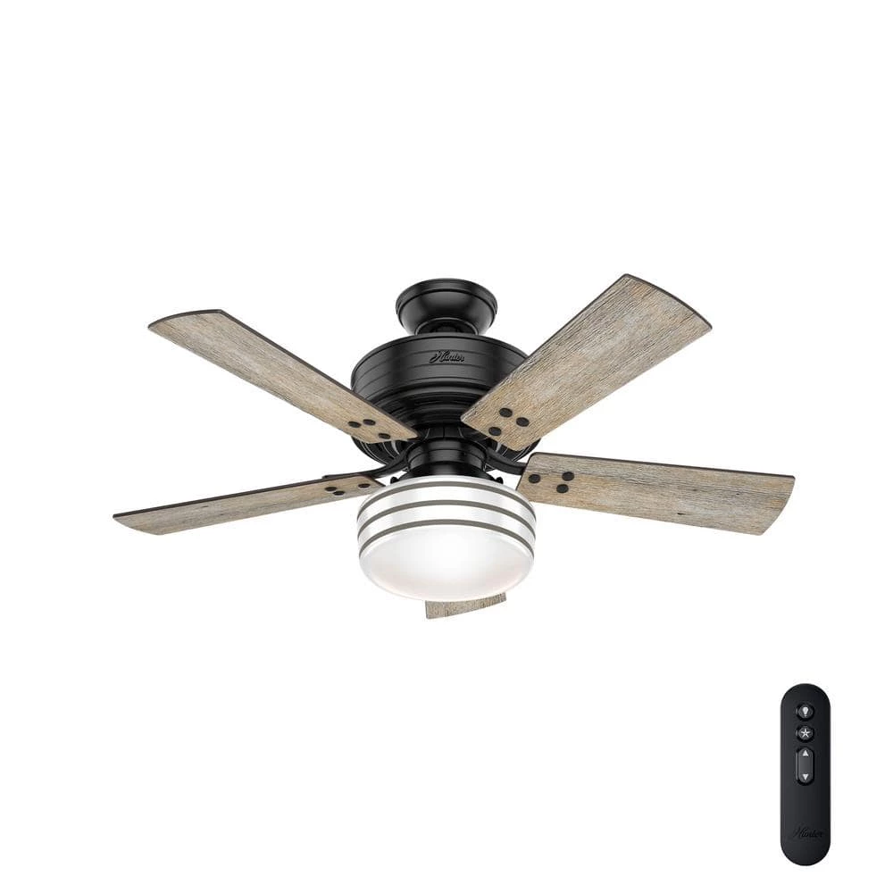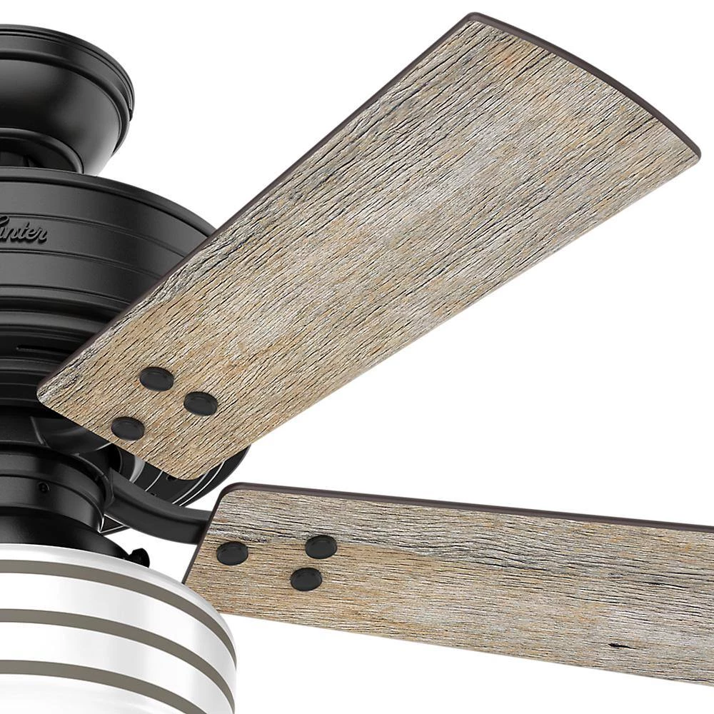Make a room cooler with this Hunter Cedar Key 44-in. ceiling fan. Great for covered porches and patios, this damp-rated fan provides four speeds for maximum airflow. It offers a 3-speed WhisperWind reversible motor for quiet operation. For versatile lighting options, it includes one dimmable 9W LED bulb and a handheld remote. Navy-striped glass, a matte black finish and five reversible blades create a classic look.