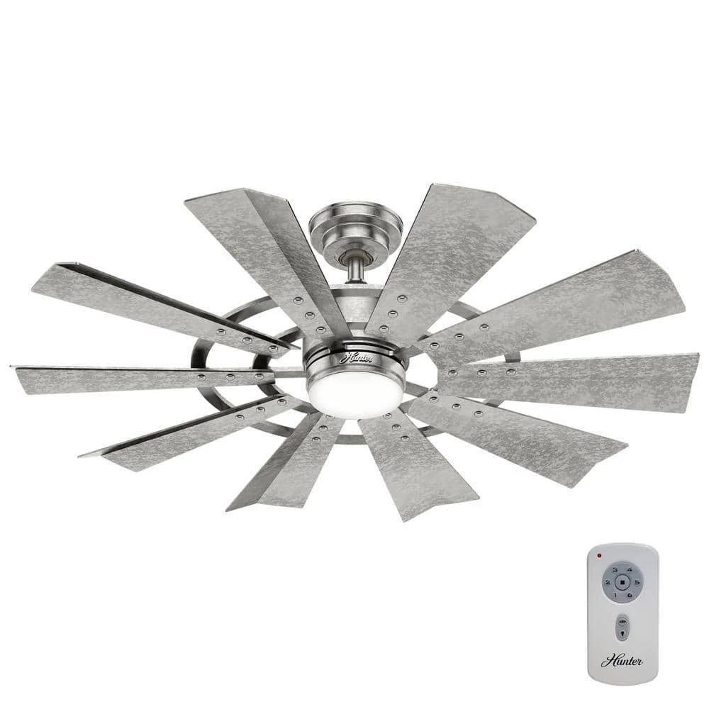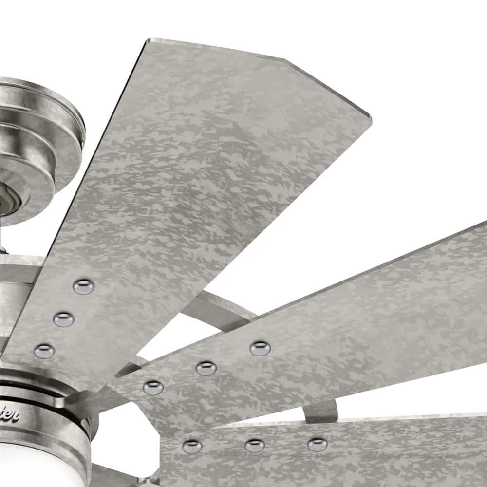 For rustic and farmhouse style patios needing extra light and cooling, the windmill inspired Crescent Falls ceiling fan is the statement fixture you’ve been looking for. Featuring a damp rating, this ceiling fan with light is designed to withstand moisture and humidity on covered porches and patios. The 10 Galvanized fan blades add to the casual aesthetic and are powered by the 6-speed DC motor. Easily control this outdoor ceiling fan’s speed and dimmable, integrated LED light with the included wall control.