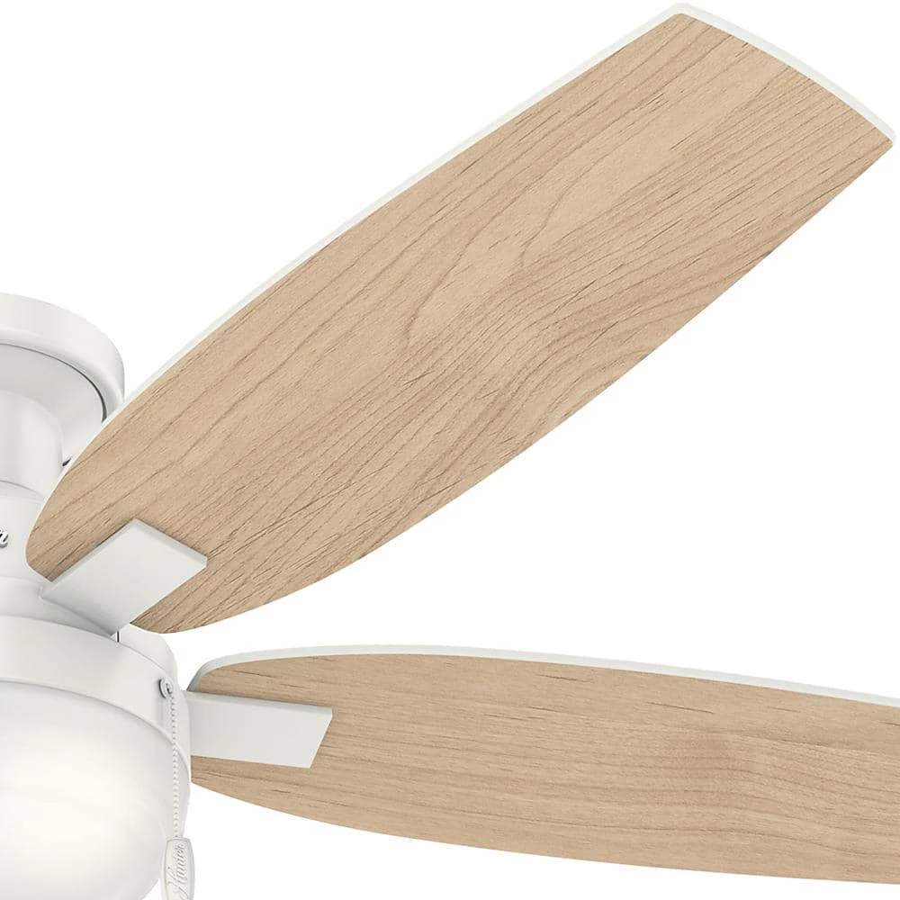 - Flip the blade: This fan features five reversible fresh white and natural wood blades to help match your room’s design