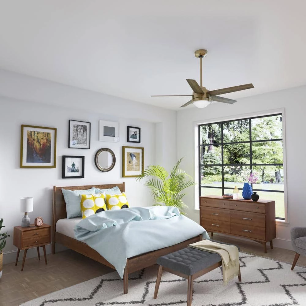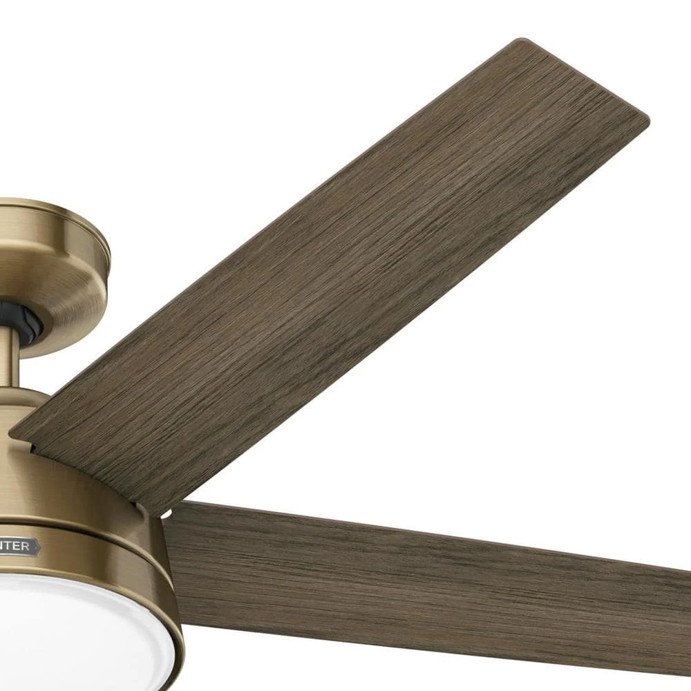 Make your bonus room, home office or living room even cooler-and cozier-with the Lykke burnished brass ceiling fan. Built with our SureSpeed Technology and 3-speed WhisperWind motor, this modern ceiling fan delivers a quiet, smooth performance while brightening up any casual indoor space. Equipped with LED light bulbs and a handheld remote.