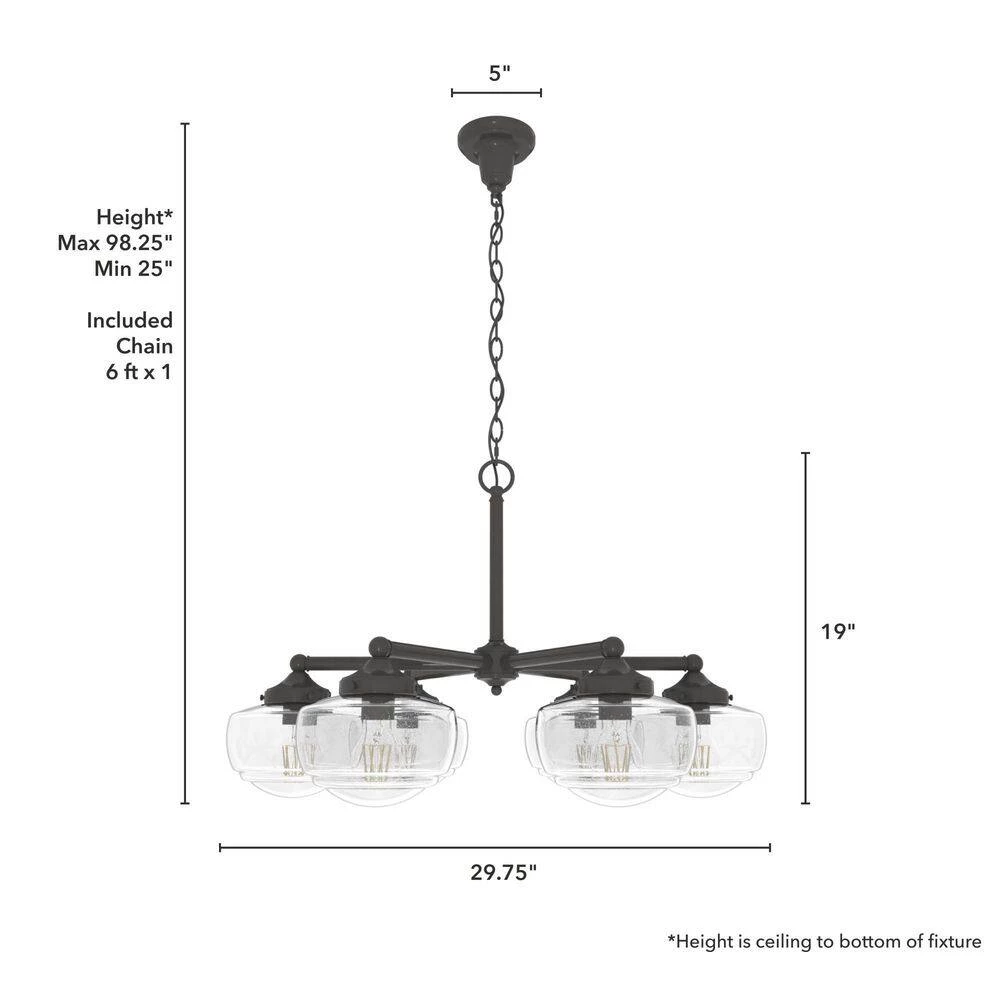 The Saddle Creek 6-light chandelier illustrates the contemporary design principle of better, not more. 6 classic glass globes-available in cased white or clear seeded glass-are offset by the simplicity of the chandelier’s metal finish. in keeping with traditional schoolhouse style, a decorative ceiling canopy elevates this fixture to the head of the class.