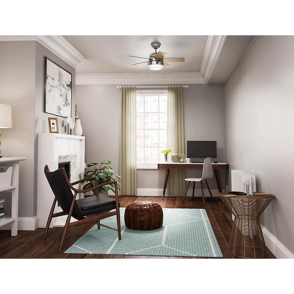 The Scandinavian style lighting complemented by a mid-century color palette along with the rounded edges throughout the Tarrant gives it a soft modern look. With a 36 in. blade span, this petite fan is perfect for small spaces like home offices, hallways and even bathrooms. But don’t let its size fool you: This modern ceiling fan packs a punch when it comes to airflow and keeping you cool.